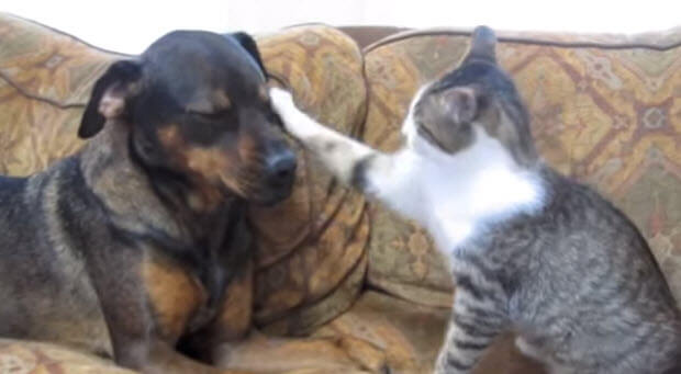 Dog and Cat Play Fighting For A Couch, See The Soft Right Hook By Cat